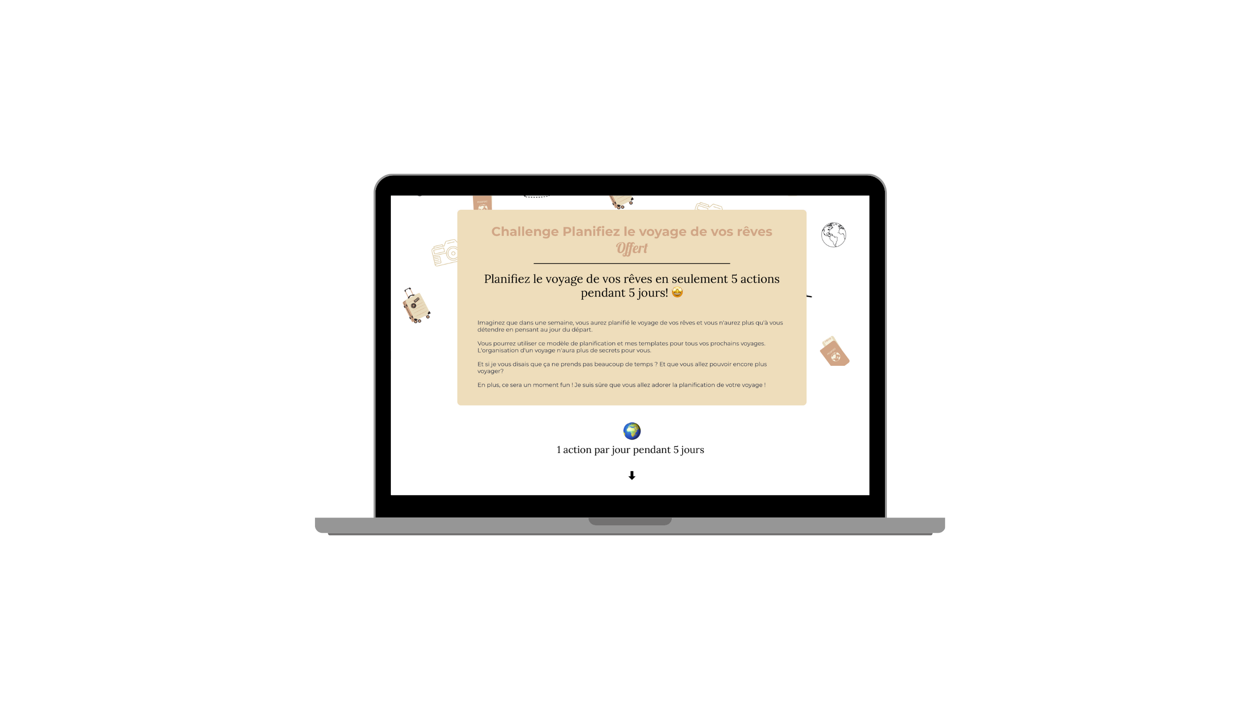 Une fois inscrit, vous recevez votre premier Challenge directement dans votre boîte mail. L'aventure continue pendant 4 jours, à raison d'un défi par jour. Je vous guide pas à pas, et vous n'avez qu'à suivre les étapes pour planifier le futur voyage de vos rêves en seulement 5 étapes.